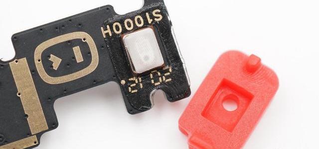 頂部控制按鍵所在的小板,正面可以看到兩側的麥克風上都有紅色的硅膠保護罩。