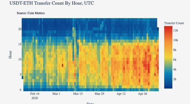 例如,如果每天有10萬USDT_ETH轉移量,并且有6000單位發生在UTC時間8:00-9:00之間,則該小時內的轉賬總額占每日總額的6%,并將顯示為黃色/橙色。這讓我們對每天的使用模式有了更清晰的了解,而不管傳輸的總數是多少。