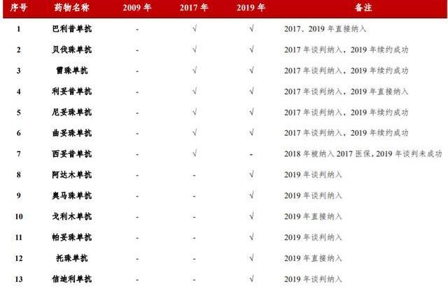 我國基本醫療報銷的報銷范圍在向臨床價值高的單抗等創新藥物傾斜。人社部2017年7月發布《人力資源社會保障部關于將36種藥品納入國家基本醫療保險、工傷保險和生育保險藥品目錄乙類范圍的通知》,將36種談判藥品納入國家2017年醫保目錄,其中包含曲妥珠單抗等5個單抗藥物。2018年10月,國家醫保局印發《關于將17種抗癌藥納入國家基本醫療保險、工傷保險和生育保險藥品目錄乙類范圍的通知》,將西妥昔單抗納入國家醫保目錄。2019年11月,國家醫保局、人力資源社會保障部印發《關于將2019年談判藥品納入<國家基本醫療保險、工傷保險和生育保險藥品目錄>乙類范圍的通知》,將97種臨床價值較高的談判藥品納入國家2019年醫保目錄,其中涉及英夫利昔單抗等9種單抗藥品。政策支持下,單抗藥物已從2009年醫保的零納入升至2019年醫保的13個,比2017年的7個翻了近一倍。單抗藥物納入醫保后,一般60%-70%的費用由醫保報銷,且藥品價格出現大幅下降,患者整體支付壓力大幅下降,進而實現快速放量。醫保對單抗藥物覆蓋持續擴容,將加速單抗藥物市場空間的釋放。