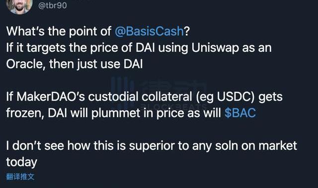 來自谷歌的TylerReynolds表示,他并不明白類似于Basis的算法穩定幣的作用是什么。因為Uniswap僅使用DAI就可以滿足預言機的要求,而如果DAI的價格下跌,則存在關聯性BAC的價格同樣下跌。