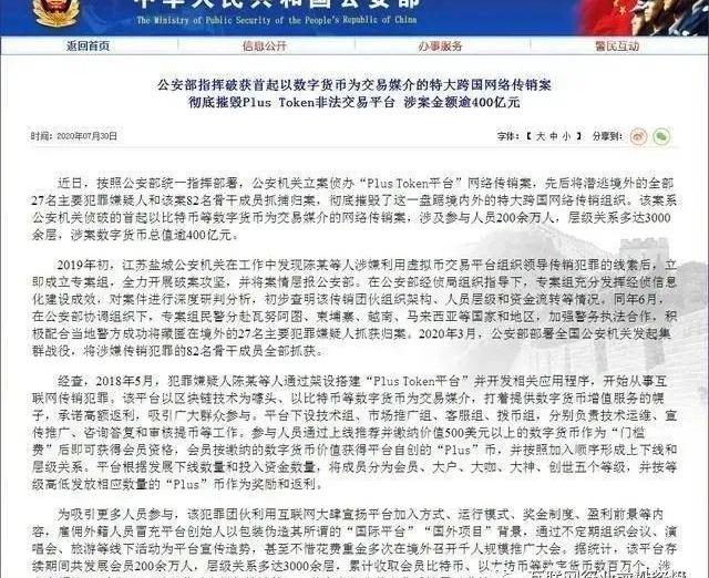 PlusToken平臺此前為“幣圈第一大資金盤”,其以區塊鏈技術為噱頭、以比特幣等數字貨幣為交易媒介,打著提供數字貨幣增值服務的幌子,實質是網絡傳銷。涉及參與人員200余萬人,層級關系多達3000余層,涉案數字貨幣總值逾400億元。