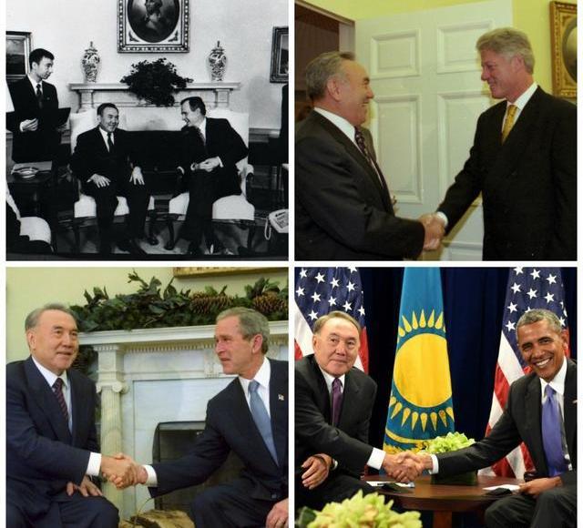 ▲哈薩克斯坦獨立后的第一任總統納扎爾巴耶夫,與1988年以來歷任美國總統會面