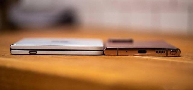 微軟SurfaceDuo的設計可以比作像護照一樣的小冊子。合上后,它只比三星GalaxyNote20Ultra略厚,為9.9mm,而Note20Ultra的厚度為8.1mm。打開后,它的厚度約為合上后的一半,只有4.8mm,只比USB-C接口厚了一點點,這確實體現了微軟的工藝設計和制造水平。可折疊手機一個不足之處在于它們在合上的時候通常和兩部手機一樣厚,而SurfaceDuo有效的改善了這一情況。