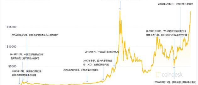 盡管比特幣的支付、交易功能一直受到爭議,其作為投資品仍然走進了大眾視野。或受機構資金入場影響,10月下旬,比特幣價格一飛沖天,短短一個月時間內從11000美元接連突破數道價格關卡,在11月30日一度突破歷史最高價格,直逼20000美元大關。12月16日晚,比特幣終破20000美元,此后不斷刷新歷史記錄,24小時內漲幅超3000美元,突破23000美元大關。