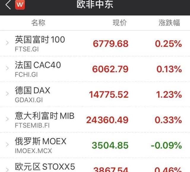 歐股方面,主要股指收漲,截至收盤,英國富時100指數漲0.25%,報6779.68點。法國CAC40指數漲0.13%,報收于6062.79點。德國DAX30指數漲1.23%,報14775.52點。