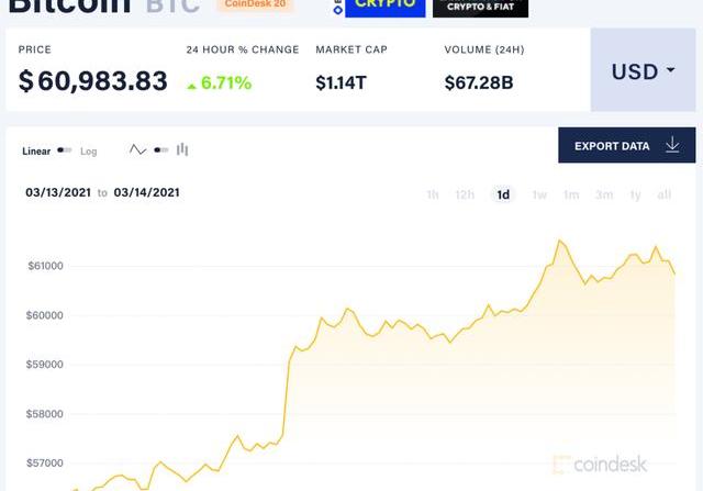3月13日,比特幣價格一度突破6萬美元/個,創下歷史新高。市值超過1.14萬億美元。