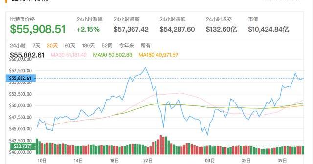 XRP/HKD-2.3%繼2月底之后,今日比特幣再次登上5.7萬美元高點。據加密數字幣行情網站比特范顯示,3月11日凌晨3時許,比特幣價格沖至5.7萬美元以上,最高至57277美元,創下近兩周來的新高。不過,隨后比特幣價格持續下滑。截至記者發稿,比特幣最新價格在55908.51美元,24小時漲幅為2.15%,市場價值重回1萬億美元。