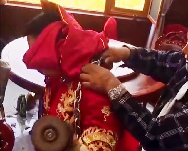 徐州一新郎被親友用鐵鏈鎖頭,結果鑰匙卻丟了。