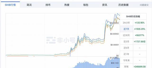 首先開始暴漲的是柴犬幣,據非小號的行情數據,柴犬幣的價格在一周內上漲了1935%,繼5月8日夜間一夜暴漲1000%以上后,在5月10日又瘋漲300%左右。