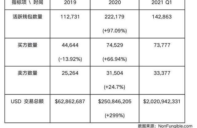 NFT市場逐年呈倍數級增長,2019年到2020年,USD交易總額從6286萬美元上漲到2.5億美元,增長近三倍。2021年NFT受益于DeFi生態取得繁榮發展,據NoFungible數據顯示,僅第一季度NFT市場交易額便已超過2020年全年8倍,約為20億美元,。