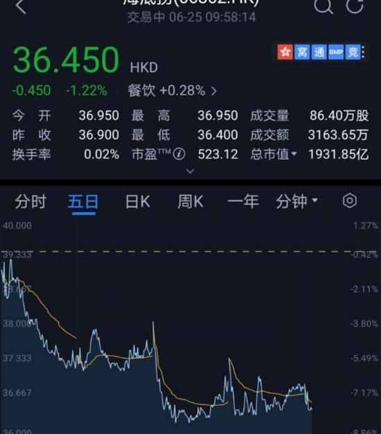 繼上周海底撈市值跌破2000億港元后,6月21日其股價再度跌超5%,四個月跌幅56%,市值跌超2500億港元登上微博熱搜。