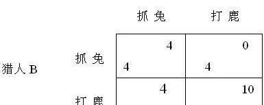 獵鹿博弈出自法國啟蒙思想家盧梭著的《論人類不平等的起源和基礎》,具體內容是:古代的村莊有兩個獵人。當地的獵物主要有兩種:鹿和兔子。如果一個獵人單兵作戰,一天最多只能打到4只兔子。只有兩個一起去才能獵獲一只鹿。從填飽肚子的角度來說,4只兔子能保證一個人4天不挨餓,而一只鹿卻能讓兩個人吃上10天。這樣兩個人的行為決策可以形成兩個博弈結局:分別打兔子,每人得4;合作,每人得10。這樣獵鹿博弈有兩個納什均衡點,那就是:要么分別打兔子,每人吃飽4天;要么合作,每人吃飽10天。并配下圖說明:
