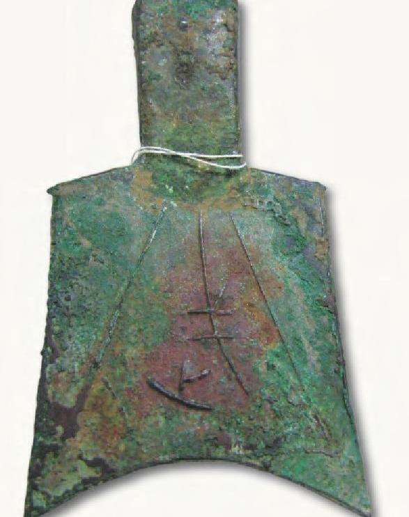 另外一種就是小型聳肩尖足空首布,形狀上和大型聳肩尖足空首布沒有什么區別,唯一的不同就是大小上,小型的長度一般在11.7到12.5厘米,寬度在4.7到5.3厘米,重量在25.3到30.7克,在數量上小型的要比大型更為罕見,因此收藏價值更高。