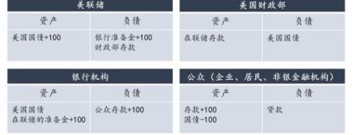 情況二:美聯儲發行100美元貨幣從公眾手中購買國債100美元。美聯儲資產端“美國國債”科目增加100美元,負債端“銀行準備金”增加100美元;銀行資產端“在聯儲的準備金”增加100美元,負債端“公眾存款”增加100美元;公眾資產端100美元國債轉化為100美元存款。該情況下美聯儲資產負債增加100美元,銀行資產負債也增加100美元,法定存款準備金率為0%的情況資產端增加的是100美元超額準備金,銀行信用派生能力提升。