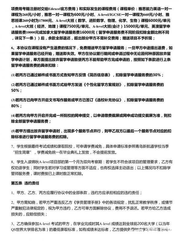為落實此事,信網聯系到青島新航道教育市南雅思校區,負責人文老師表示,此前為了讓家長了解關于退費的規定,協議上的相關內容寫得非常詳細,還特別進行加粗處理,提醒家長留意查看,并且有老師口頭再向家長闡述一遍,以免日后產生糾紛。