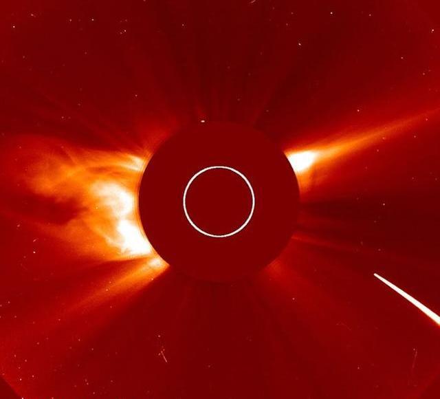 據ETtoday(戴榕萱):由歐洲太空總署(ESA)與美國太空總署(NASA)的日光及日光層觀測衛星(SOHO)拍下掠日彗星于日前通過太陽附近慘遭氣化粉碎的慘烈畫面,此彗星以209萬公里/時的速度朝太陽方向運行,多數彗星都會在離太陽表面138公里處就被撕碎、瓦解,而今年正巧在8月4日被衛星拍攝到。