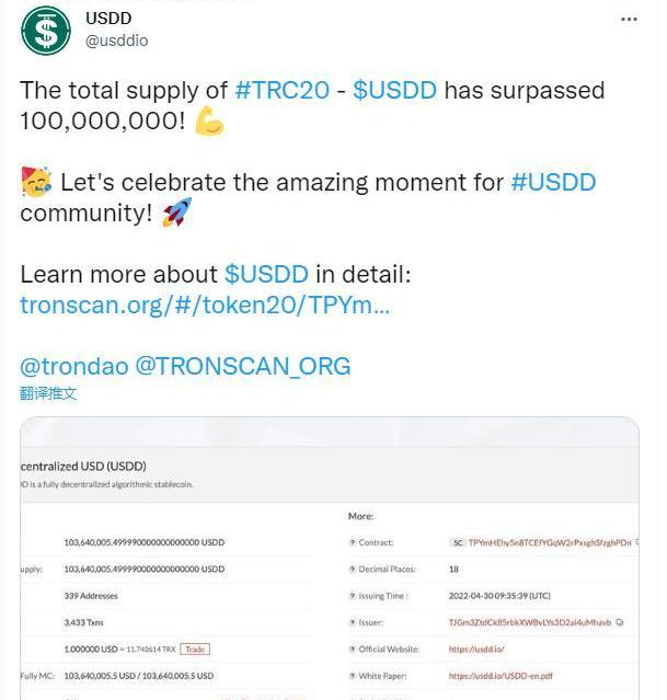 5月5日,波場TRON創始人孫宇晨通過推特發布公開信稱:波場宣布正式進軍去中心化穩定幣USDD。同時,波場DAO將聯合區塊鏈行業的主流機構發起成立波場聯合儲備(TRONDAOReserve),以數學與算法實現人類的金融自由。USDD正式隆重上線。