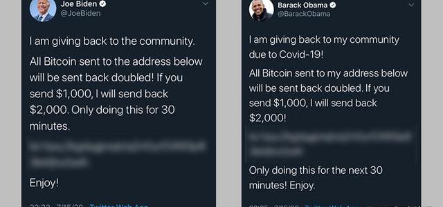 2020年7月,知名人士的Twitter賬戶遭到黑客攻擊。其中包括埃隆·馬斯克、喬·拜登和巴拉克·奧巴馬的賬戶。冒名頂替者承諾以回饋社區的名義將發送到指定比特幣錢包的比特幣翻倍。