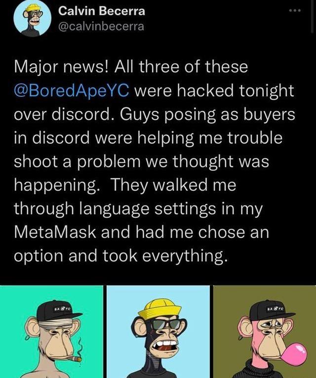 BoredApeYachtClub由價格最高的限量版NFT組成。不幸的是,企業家CalvinBecerra于2021年10月31日成為騙局的受害者,他失去了他所有3個無聊猿NFT。