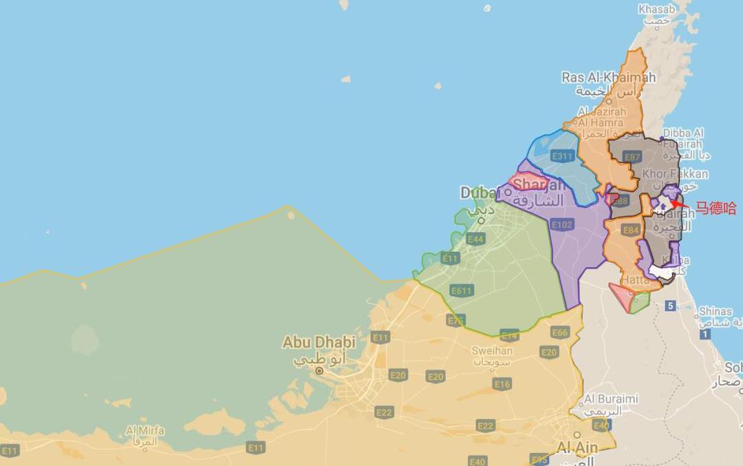 ▲阿聯酋酋長國分布,東北部交錯雜居但大多數地方部落選擇效忠的對象,都是特魯希爾內部的各酋長國。唯獨有兩個地方,考慮的是要效忠阿曼還是效忠特魯希爾。被各酋長國包圍的馬德哈地區、以及被馬德哈包圍的那赫瓦,都沒有明確選擇效忠任何一個酋長國、或者效忠阿曼。因此,馬德哈和那赫瓦地區的歸屬權一直未定。20世紀30年代到40年代,馬德哈地區的長老選擇加入了阿曼。而全境被馬德哈包圍的那赫瓦地區則選擇加入了特魯希爾的沙迦酋長國。馬德哈的長老則認為,阿曼雖然如今是英國的保護國,但歷史上的阿曼曾經建立起強大的政權。因此,加入阿曼可以得到阿曼的保護。
