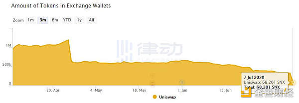 在 6 月 1 日之后的時間里,SNX 的價格已大幅上漲,從 0.75 美元的低點漲至 2.90 美元的高點。之所以出現這種拋物線型增長,是因為對代幣的需求遠遠超過了流通量。正如一位用戶指出的那樣,三個月前 Uniswap 擁有超過一百萬個 SNX,而現在還剩下六萬多。