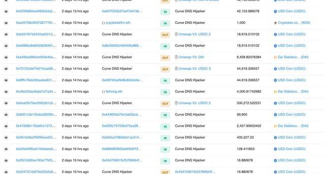 XRP/HKD-1.53%2022年8月10日,去中心化穩定幣交易協議CurveFinance突遭DNS劫持攻擊,本次事件中共有價值約61.3萬美元的穩定幣被盜取,被盜資金被攻擊者兌換成ETH并分批進行轉移。Curve隨即發出警告,提醒用戶暫時不要使用Curve.fi域名,并立即解除合約授權。