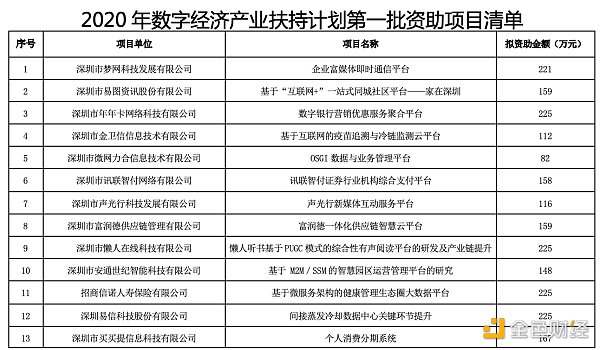 此外,金色財經觀察到,在深圳市工業和信息化局下達的《2020年數字經濟產業扶持計劃第一批資助項目清單》中,多個區塊鏈公司已獲得資金扶持,包括:深圳市中農網有限公司(中農網區塊鏈服務Z-BaaS平臺)、深圳市網安計算機安全檢測技術有限公司(基于聯盟區塊鏈的電子數據保全平臺)、深圳銀鏈科技有限公司(銀鏈區塊鏈中間件開發平臺應用)、眾安信息技術服務有限公司(區塊鏈OAP系統)、深圳華大基因科技有限公司(基于區塊鏈的基因數據安全溯源與共享應用軟件產業化)、鼎鉉商用密碼測評技術(深圳)有限公司(基于國產密碼的聯盟區塊鏈平臺聚龍鏈的研究及示范應用)等。