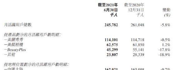 不過,美圖月活躍用戶數卻略有下降,從2020年上半年的2.61億人下降到今年6月末的2.46億人,同比下降5.8%。其中,美圖秀秀的月活躍用戶數量同比微跌0.%,美顏相機用戶數同比增加1.2%,而BeautyPlus及其他業務則同比分別下降17.8%和18.9%。如果從用戶的地理位置來看,中國大陸用戶數量總體持平,海外用戶數量同比下降14.5%。