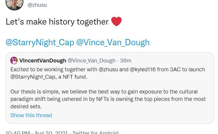 XRP/HKD-3.97%巴比特訊,8月30日,三箭資本聯合創始人KyleDavis及首席執行官ZhuSu轉發VincentVanDough推文。該推文表示,“很高興能與三箭資本的zhusu和KyleDavis合作推出NFT基金StarryNight。我們相信獲得NFTs帶來的文化范式轉變的最佳方式是擁有最受歡迎系列中的頂級產品。許多人對基金進入這一領域有擔憂,我們將尋求始終為社區做正確的事情。在年底之前,我們的目標是推出一個NFT教育門戶網站,探索為新晉藝術家帶來更多曝光機會的方法,在一個主要城市推出實體畫廊,確保收藏的作品通過虛擬畫廊向公眾開放,并嘗試各種社區建設舉措。NFT領域不是零和游戲,它是由強大的飛輪效應驅動的,當蛋糕對所有人來說都在增長時,它的效能是最好的。”