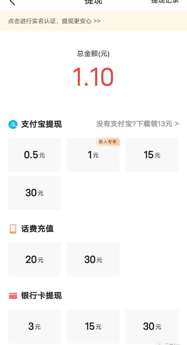 提現方面,今日頭條極速版有支付寶提現、銀行卡提現、話費充值三種選項。支付寶提現金額包括0.5元、1元、15元、30元。其中,1元為“新人專享”。銀行卡提現金額為3元、15元、30元。話費充值金額為20元和30元。