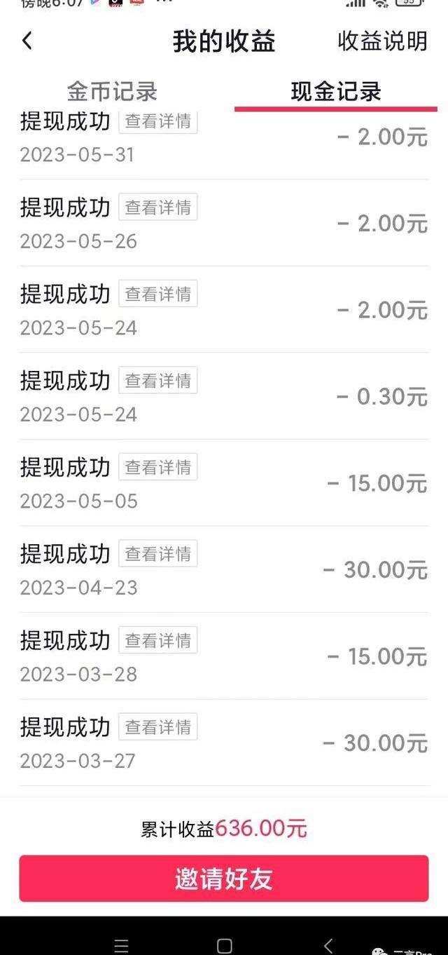 從這位老人提供的提現記錄截圖可以看到,她的累計收益達到了636元。不過,這636元是刷了好幾年才攢出來的。