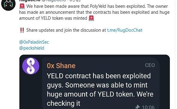 XRP/HKD-0.67%北京時間7月28日,安全公司Rugdoc在推特表示,收益耕作協議PolyYeldFinance遭到攻擊,所有者已宣布合約已被利用并鑄造了大量YELD代幣。CoinGeckko行情顯示,YELD代幣價格直線跳水歸零,狂跌100%。