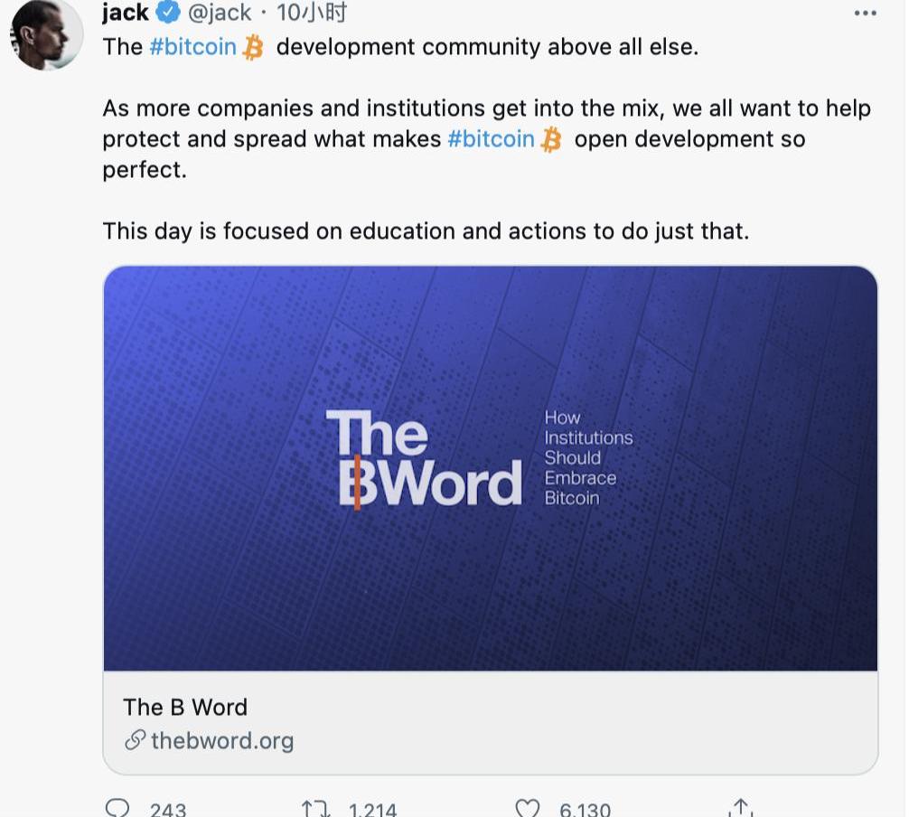 XRP/HKD-5.59%巴比特訊,6月25日,推特CEOJackDorsey發推表示,#bitcoin開發社區高于一切。隨著越來越多的公司和機構加入其中,我們都希望幫助保護和傳播讓#bitcoin開放開發如此完美的東西。現在的重點是用教育和行動來做到這一點。