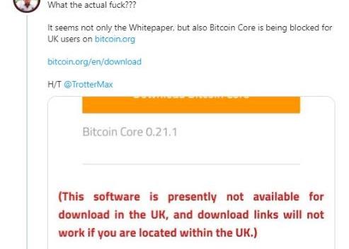 該消息的作者YuriMolchan是一個幣圈的記者,根據翻譯,實際上應該是比特幣白皮書和比特幣核心軟件僅僅是在英國境內用戶被限制下載,也就是說在其他國家是沒有限制的。因此目前除了英國之外的其他國家是可以正常下載和傳播的,而因為機譯的原因,使得內容產生了誤解。