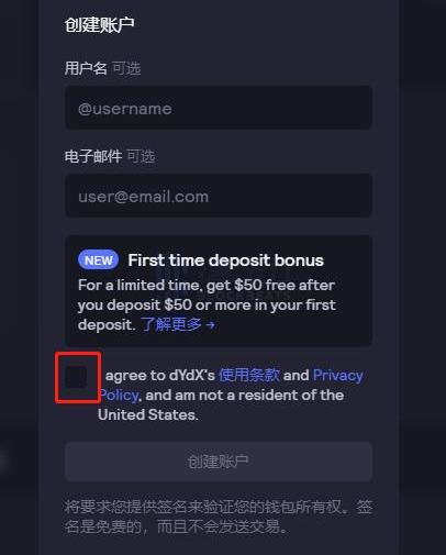 3.新用戶由于此前未在dYdX上創建過賬戶,因此需要創建一個,根據指示填寫用戶們及電子郵件即可,也可以不填。但是需勾選「已通用dYdX使用條款及隱私政策,確保本人非美國居民」的聲明。之后就可以創建新賬戶了。