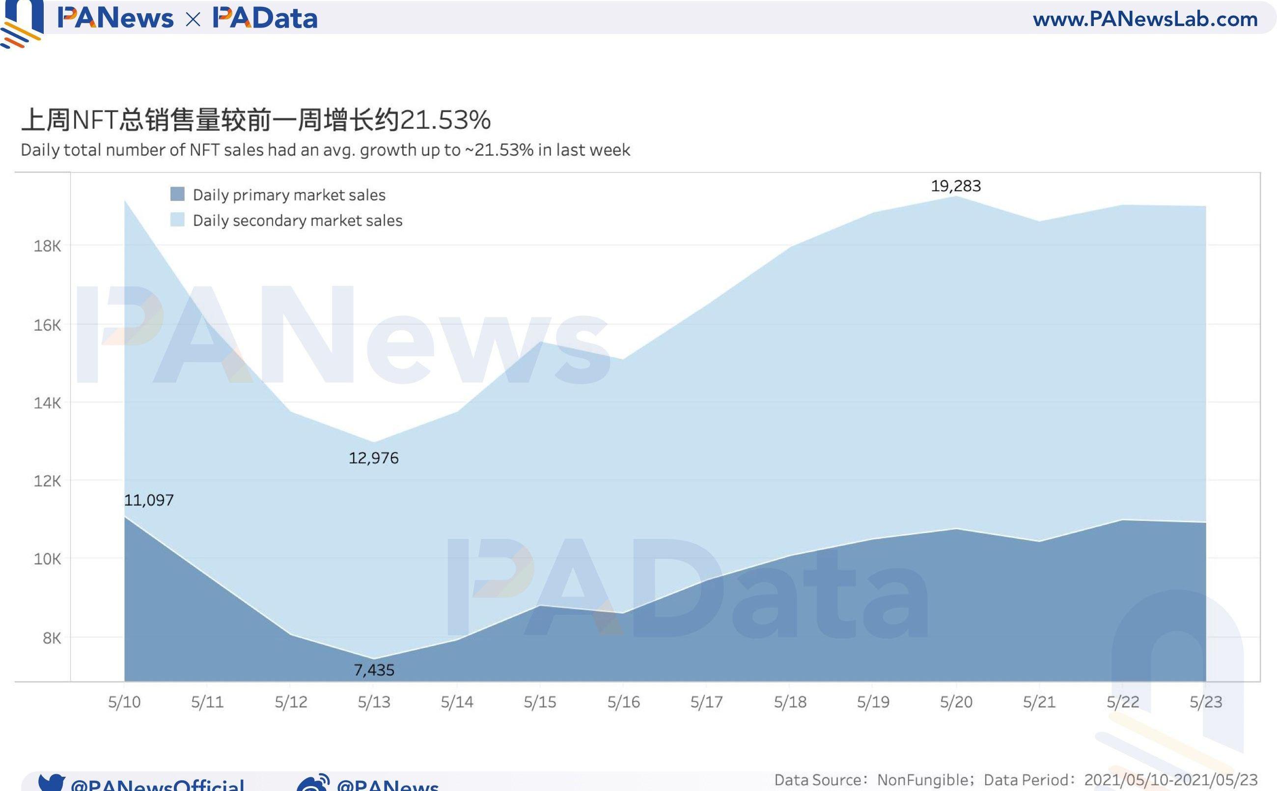根據NonFungible的數據,上周,NFT總銷售量在經歷了幾周的持續下跌后有所“回暖”。上周日均銷售量約為1.85萬件,較前一周增長約21.53%。截至5月24日,NFT銷售量為1.95萬件,較7日前上漲約17.98%。上周,首次交易的NFT數量占總銷售量的比例約為56.54%,周環比小幅下降約2.06%;二次交易的NFT數量占總銷售量的比例約為43.46%,周環比小幅上浮2.82%。昨日,首次和二次交易的NFT數量占總銷售量的比例分別為57.40%和42.60%,與7日前基本保持不變。