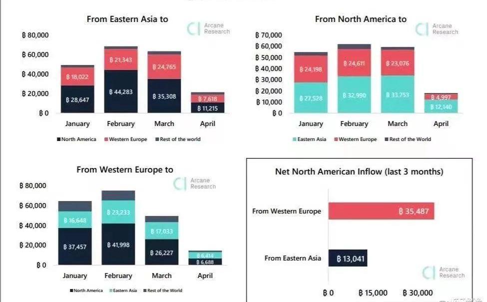 這一趨勢在2021年依舊持續。如上圖所示,過去三個月,北美的比特幣服務商獲得并累積了來自西歐和東亞實體的近5萬枚比特幣凈流入,其中超35000枚BTC來自西歐,超13000枚BTC來自東亞。