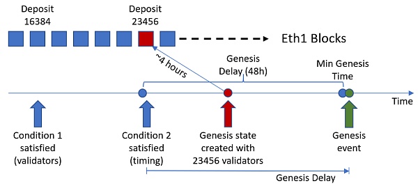 如果存款數額首先滿足要求,那么創世事件會在最早創世時間后幾秒啟動。創世狀態包含這個時間點48小時以前的所有注冊了的驗證者。