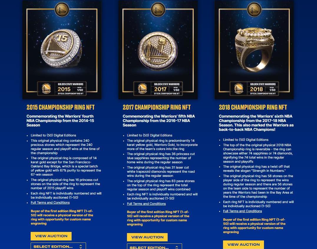 購買「勇士NBA冠軍戒指」NFT第一版的競標者還將獲得相應的實物“勇士冠軍戒指”。成功競標一對一NBA冠軍NFT的中標者,將獲得由比佛利山莊的珠寶商杰森制作的獨一無二的實體戒指,并在未來的勇士主場比賽中在場上獲得該戒指。購買了所有六個冠軍戒指NFT并完成套裝的收藏家將解鎖「勇士冠軍橫幅NFT」。