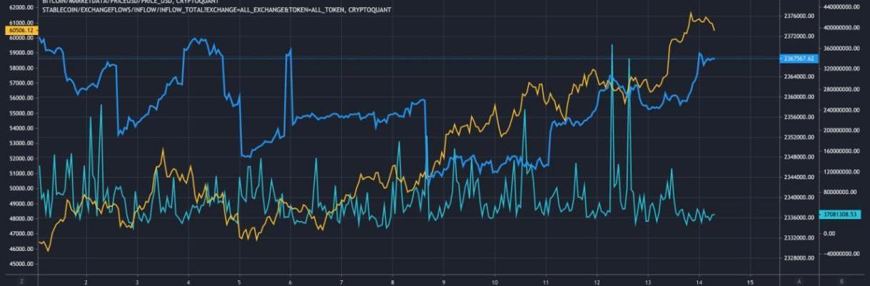 根據CryptoQuant的最新數據,盡管比特幣的價格暫時下行,但是流入交易平臺的穩定Token數量再次上升。