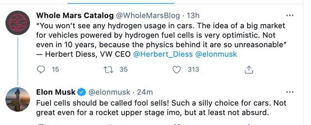 當地時間11日下午,特斯拉CEO馬斯克對燃料電池開炮。其在推特上發文,稱燃料電池應該被叫做智商稅,用于汽車上是個愚蠢的選擇。在他看來,燃料電池就算是用在火箭上也不是很好的主意,但至少不像用在汽車上那么荒謬。值得一提的是,目前各個國家都在鼓勵發展燃料電池汽車,各大車企也正在加大對燃料電池汽車對研發投入。