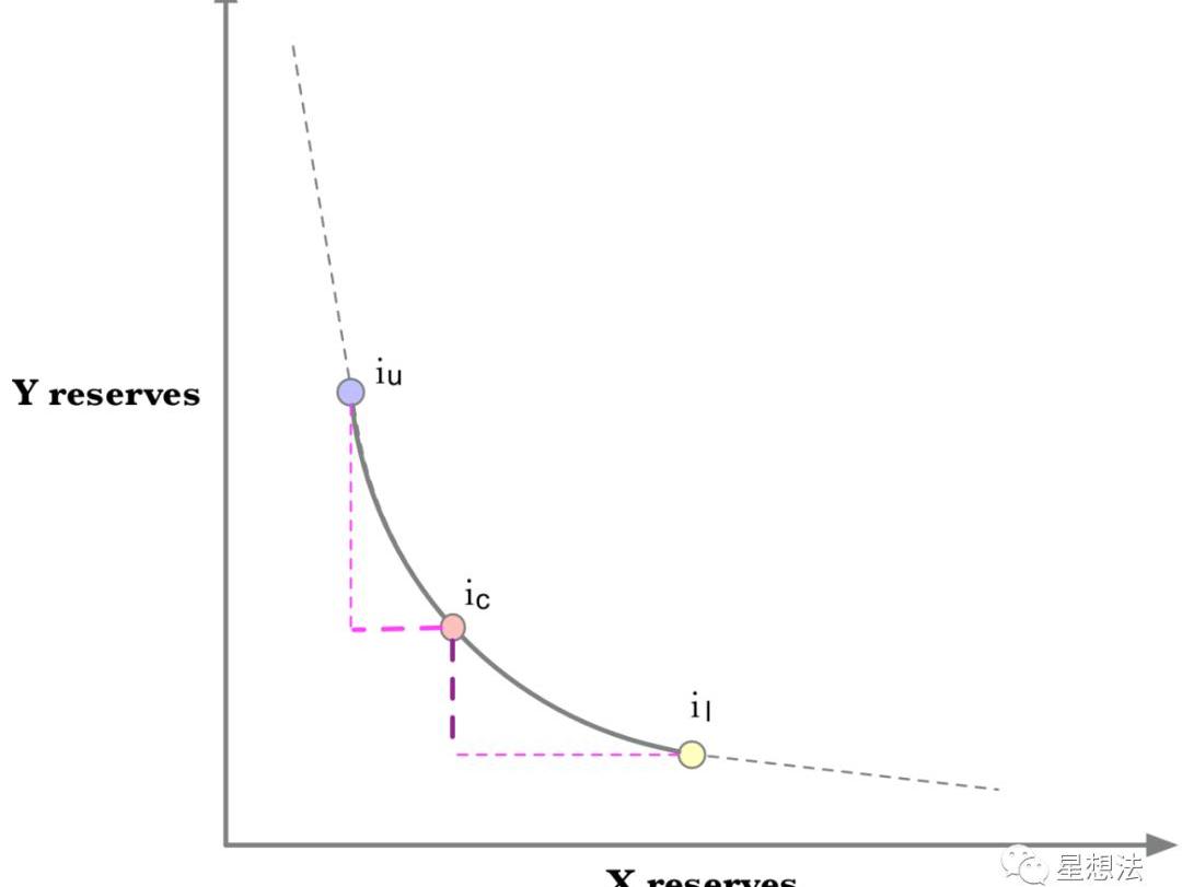 因為當前價格遠低于il,即使從當前價格向iu滑動,也只需要x的資金,不需要y的資金。所以,在這種情況下,delta_Y=0。因為從il滑向iu需要整個區間的x的資金,對于delta_X來說,價格變化為1/sqrt(il)-1/sqrt(p(iu))。