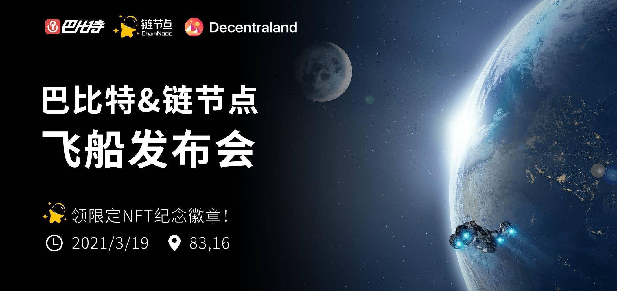 3月19日21點,巴比特攜手鏈節點在Decentraland虛擬世界中舉行飛船發布會。本次活動截止至4月19日18點,玩家進入Decentraland世界—巴比特飛船。巴比特飛船入口處即可領取“發布會NFT紀念勛章”,限量888份。在評論區曬出與巴比特飛船的合影,我們會挑選50名用戶每人送出100社區金幣。