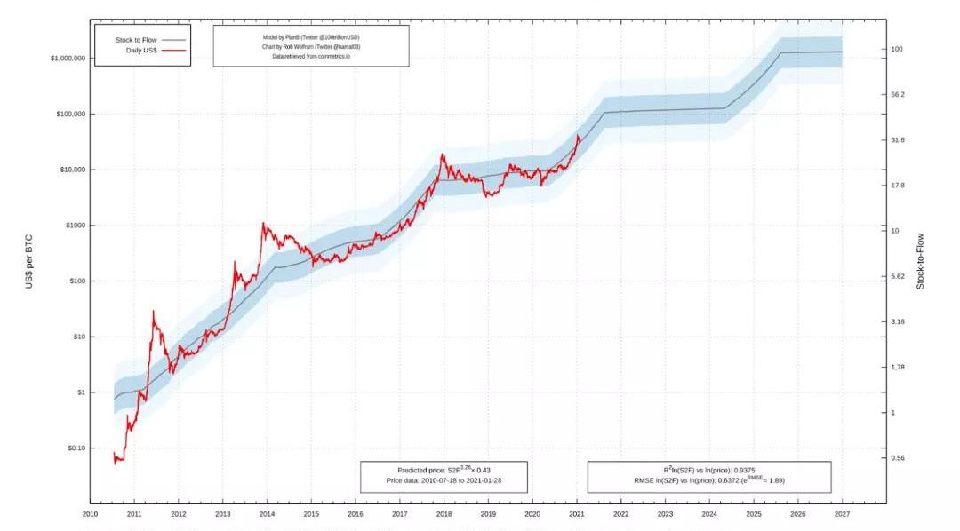 通過以對數的方式查看這些相同的數據,并跟蹤每次比特幣減半事件后價格是如何上漲的,PlanB提出了令人信服的存量到流量模型。這個模型表明,“減半”事件本身是比特幣迄今為止指數級上漲的核心,并且表面上看,未來也會如此: