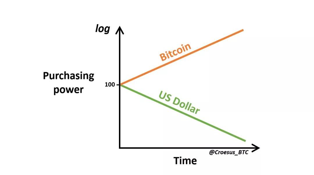 我們現在看到的兩種現代貨幣有著非常不同的DNA。第一種,法幣,被設計成隨著時間的推移,購買力呈指數級下降。第二種,比特幣,被設計成隨著時間的推移,購買力呈指數級上升。