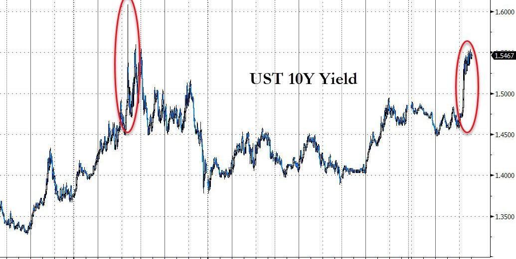 美國10年期基準國債收益率在鮑威爾講話期間短線拉升逾8個基點,站上1.50%,在他講話結束后一度升破1.55%,較日內低位升約10個基點,到美股收盤時約為1.54%,日內升6個基點,重現一周前的升勢,美股盤后又突破1.56%,向上周四升破1.6%所創的一年來高位邁進。