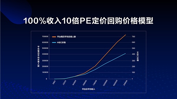 這是目前大多數市面上平臺幣的經濟模型,我們叫平臺通證的1.0模型,以BNB,HT、OK為代表,三大交易所的平臺幣作為很多投資者都有在這個上面賺到錢,當時的平臺幣經濟模型屬于部分收入通證化,可能會做季度的回收或者月度的回收。但是沒有具體的定價模型,用戶也不知道什么時候會做回購,可能突然某一天平臺覺得需要做一些回購,就會有這個回購動作。其實很多的持幣用戶也能夠感覺到,看著平臺幣價格不斷上漲,但是并沒有賺到錢。所以我們對它進行了改造,叫平臺通證的2.0版本,以HBC為代表,所有的收入全部通證化。這個回購的收入就是平臺的收入,以及霍比特隊長的激勵,這個后面具體再分析。