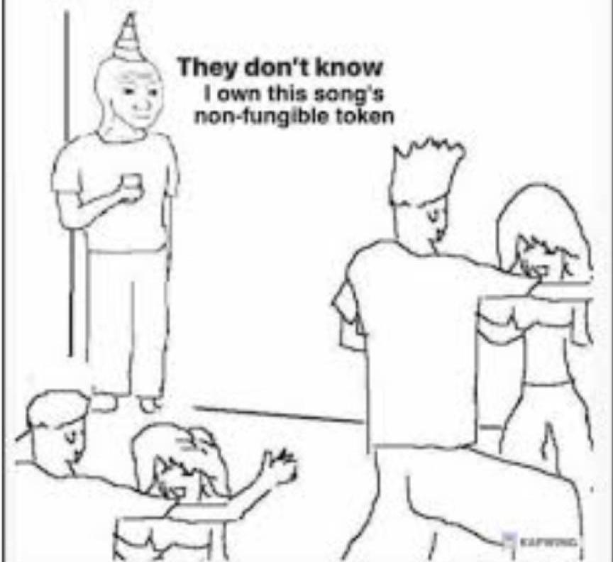 這幅畫很有意思,因為它反映了真實情況,世界上每個人都可以花1美元下載一首歌曲,然后享受美好的音樂,但一首歌的NFT又有什么價值呢?