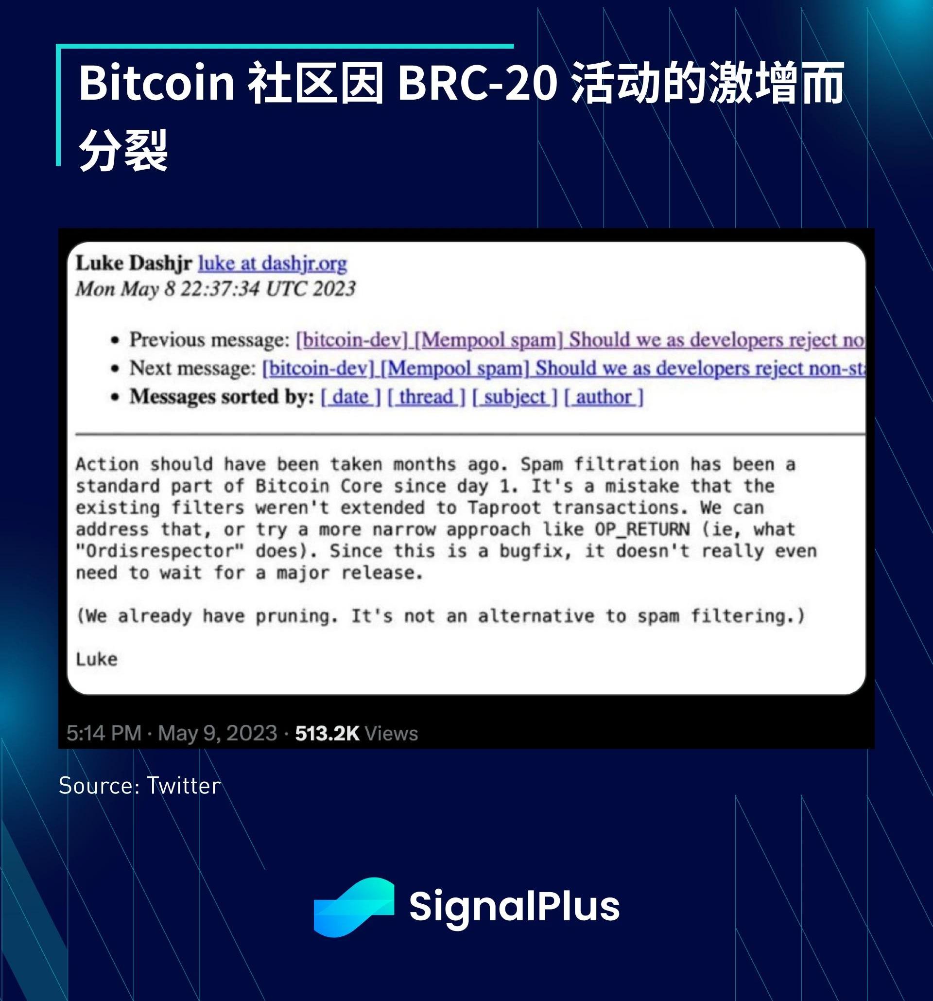 事實上,BRC-20使用的激增已讓BTC社區對這些Ordinal銘文是否有利于Bitcoin所代表的精神產生了分歧,某些BTC開發者呼吁對數據管理代碼進行小幅調整,關閉銘文活動,使網絡返回其“根源”,而其他人則表示,這對網絡來說是一個好的發展,因為它吸引了一波新的開發者和協議活動,這些都是幾年前ETH在最初的智能合約/ICO/NFT蓬勃發展時所看到的情況。