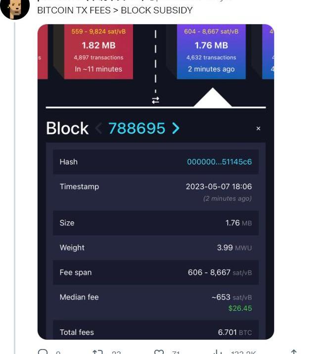 XRP/HKD-0.42%一位幸運的礦工在周日晚上賺取了6.701比特幣(BTC)或近200,000美元的交易費用,超過了比特幣當前的6.25BTC的區塊補貼——這一極為罕見的事件說明了最近與Ordinals協議相關的區塊鏈活動爆發如何導致用戶成本飆升。